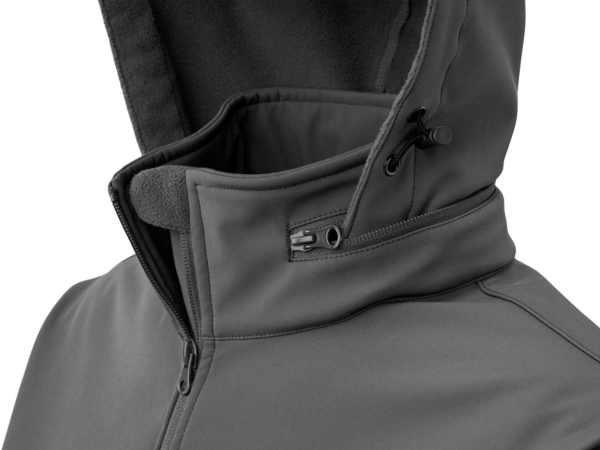 Giacca tattica pesante in softshell con cappuccio staccabile con 2 tasche interne con chiusura zip e strato esterno idrorepellente, antivento e traspirante composto da 92% poliestere e 8% spandex.